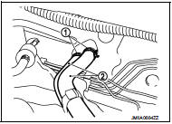 7. Remove clamps (1), and then disconnect heater hose (2) from A/C unit assembly.