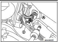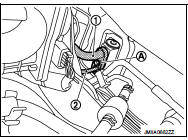 3. Remove mounting bolt (A), and then disconnect low-pressure flexible hose (1) and high-pressure pipe (2) from expansion valve.