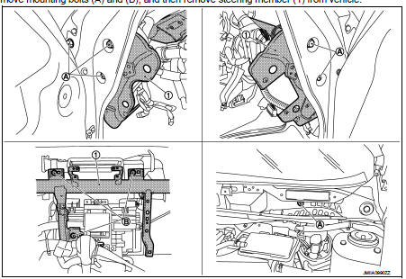 18. Remove mounting bolts (A) and (B), and then remove steering member (1) from