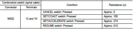 Check resistance between combination switch (spiral cable) harness connector terminals under the following conditions.