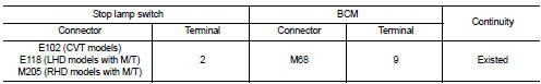 2. Check continuity between stop lamp switch harness connector and BCM harness connector.
