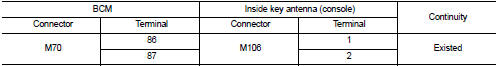 3. Check continuity between BCM harness connector and inside key antenna (console) harness connector.