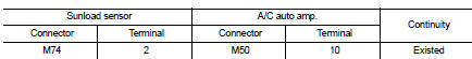 3. Check continuity between sunload sensor harness connector and A/C auto amp harness connector.