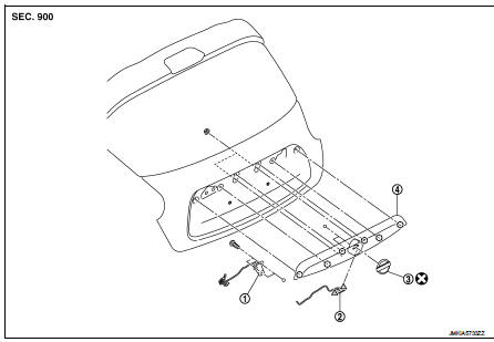 1. Remove back door trim. Refer to INT-35, "BACK DOOR LOWER FINISHER : Removal and Installation".