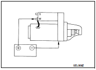 Check that the starter motor runs when connecting the positive terminal (12 V) to starter motor terminal M and the negative terminal (ground) to starter motor body.