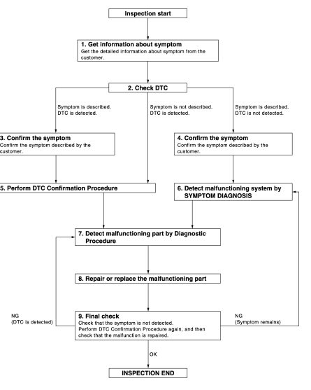 Detect malfunctioning system according to SYMPTOM DIAGNOSIS based on the confirmed symptom in step 4, and determine the trouble diagnosis order based on possible causes and symptom.