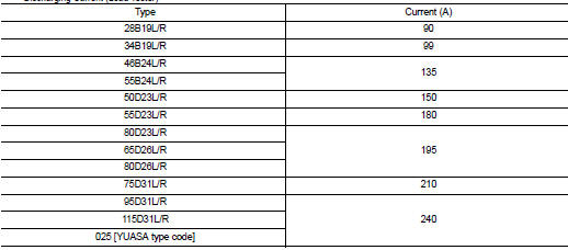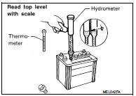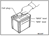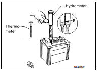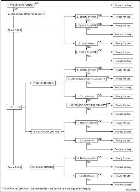 1. Check specific gravity. Refer to PG-111, "How to Handle Battery".