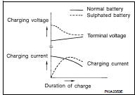 To determine if a battery has been “sulphated”, note its voltage and current when charging it. As shown in the figure, less current and higher voltage are observed in the initial stage of charging sulphated batteries.