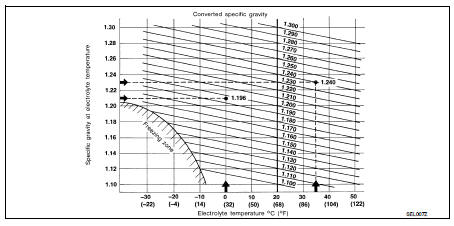 • When electrolyte temperature is 0°C (32°F) and specific gravity of electrolyte is 1.210, converted specific gravity at 20°C (68°F) is 1.196.