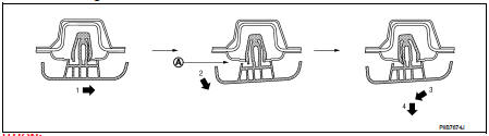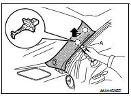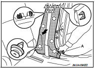 4. Disengage center pillar lower garnish fixing clips and pawls with a remover tool (A), and then remove center pillar lower garnish.