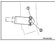 6. Remove snap pin (1) and clevis pin (2). Refer to BR-20, "Exploded View".