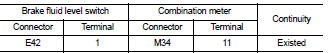4. Check continuity between brake fluid level switch harness connector and combination meter harness connector.