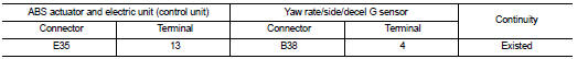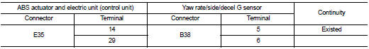 4. Check continuity between yaw rate/side/decel G sensor harness connector and ABS actuator and electric unit (control unit) harness connector.