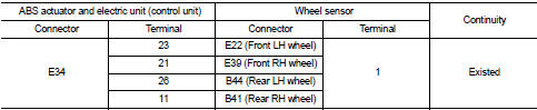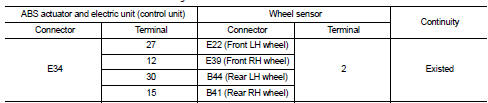 4. Check continuity between ABS actuator and electric unit (control unit) harness connector and wheel sensor harness connector. (Check continuity when steering wheel is steered to RH and LH, or center harness in wheel housing is moved.) Measurement connector and terminal for power supply circuit