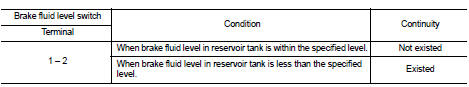 Check brake fluids level switch. Refer to BRC-194, "Component Inspection".