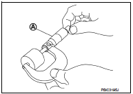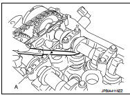 b. Use a feeler gauge (A), measure the clearance between valve lifter and camshaft.