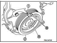 • Rotate crankshaft pulley (2) clockwise and align TDC mark (no paint) (A) to timing indicator (1) on front cover.