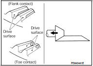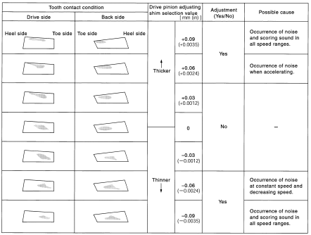 • If the tooth contact is near the flank (flank contact), or near the toe (toe contact), thin drive pinion gear adjusting shim to move drive pinion farther from drive gear.