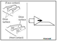 • If the tooth contact is near the face (face contact), or near the heel (heel contact), thicken drive pinion gear adjusting shim to move drive pinion closer to drive gear.