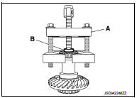 5. Set drifts (A and B) to the right and left side bearing adjusting shims individually. Press center stem assembly with side bearing to remove gear carrier assembly and rear cover assembly.