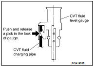 6. Pull out the CVT fluid level gauge from the CVT fluid charging pipe after pressing the tab on the CVT fluid level gauge to release the lock.