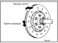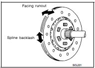 Maximum allowable spline backlash (at outer edge of disc) : Refer to CL-35, "Clutch Disc".