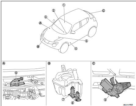 A. Cowl top, right side of engine room B. Behind front fender protector (RH) C. Back door lower finisher inside