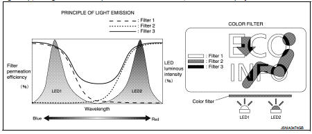 The switch integrates 2 types of LEDs*, filters that pass or absorb specified wavelengths (filter 1, filter 2), and filters adapted to both display colors (filter 3), enabling 2 different symbols to be displayed at a same position by LED changeover.