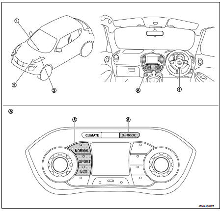 • The drive mode can be changed over as desired by pressing the D-MODE select switch. The characteristics of the engine, CVT, steering and air conditioner are changed accordingly.