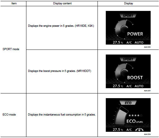 • The display shows the current drive mode (NORMAL, SPORT, ECO) as well as the vehicle information for the mode.