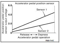 The accelerator pedal position sensor is installed on the upper end of the accelerator pedal assembly. The sensors detect the accelerator pedal position and sends a signal to the ECM. The ECM uses the signal to determine the amount of fuel to be injected.