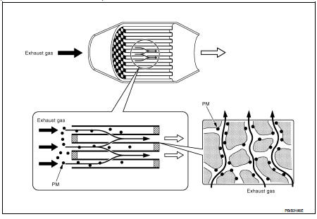 Diesel particulate filter is placed after oxidation catalyst and traps PM (Particulate Matter) in exhaust gas. Diesel particulate filter is a silicon carbide (SiC) gas permeable monolith in which ducts are alternately blocked.