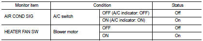 2. Select “AIR COND SIG” and “HEATER FAN SW”, and check status under the following conditions.