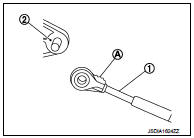 1. When connecting the control cable (1) to the CVT shift selector assembly (2), face the grooved surface of the rib (A) up and insert the control cable until it stops.