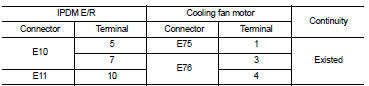 2. Check the continuity between IPDM E/R harness connector and cooling fan motor harness connector.