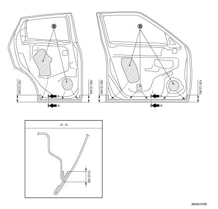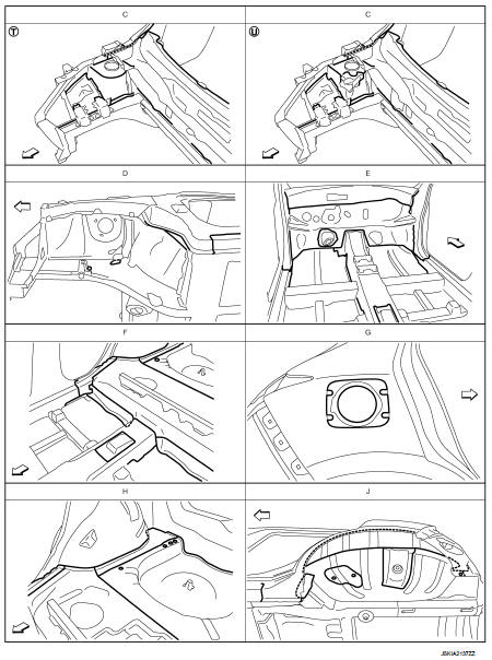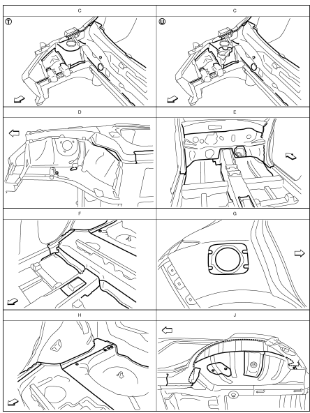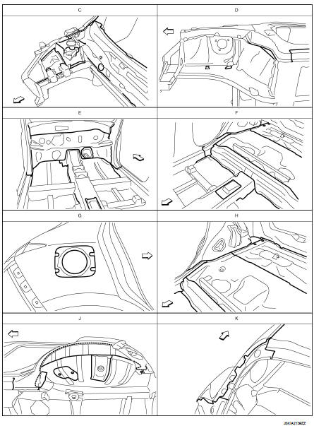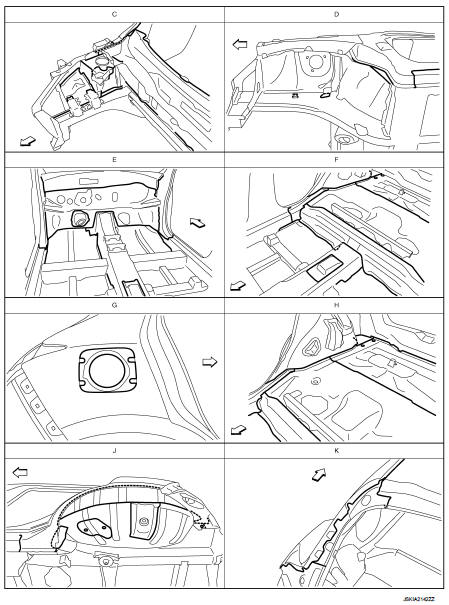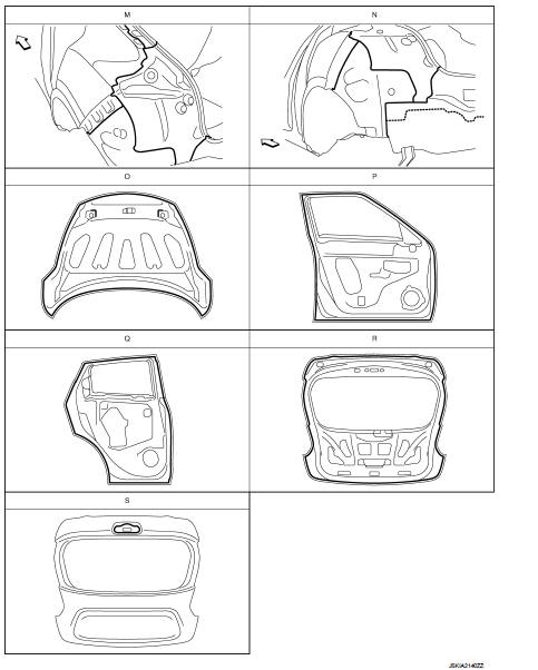 The following figure shows the areas that are sealed at the factory. Sealant that is applied to these areas should be smooth and free from cuts or gaps. Care should be taken not to apply an excess amount of sealant and not to allow other unaffected parts to come into contact with the sealant.