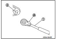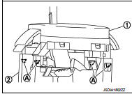 • When connecting the control cable (1) to the CVT shift selector assembly (2), face the grooved surface of the rib (A) up and insert the control cable until it stops.