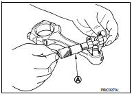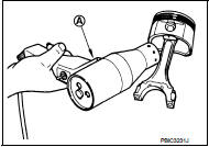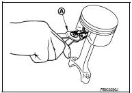 7. Remove piston from connecting rod with the following procedure: a. Using snap ring pliers (A), remove snap rings.