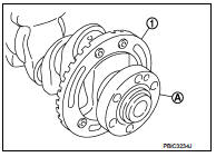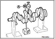 Measure the deflection of flywheel contact surface to torque with a dial indicator (A).
