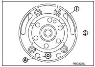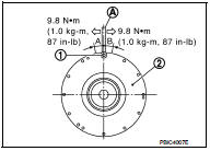 1. Install clutch cover mounting bolt (1) to clutch cover mounting hole, and place a torque wrench (A) on the extended line of the flywheel (2) center line.