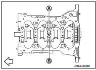 Measure crankshaft end play before loosening main bearing cap bolts. Refer to EM-112, "Inspection".