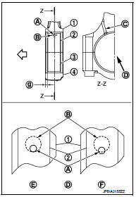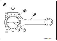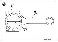 When connecting rod cap is removed after being tightened to the specified torque with connecting rod bearings (1) installed, the tip end of bearing must protrude (B). Refer to EM-104, "Disassembly and Assembly