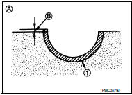 When main bearing cap is removed after being tightened to the specified torque with main bearings (1) installed, the tip end of bearing must protrude (B). Refer to EM-104, "Disassembly and Assembly".
