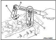 • Compress valve spring with the valve spring compressor [SST: KV10116200 (J-26336-A)] (A), the attachment [SST: KV10115900 (J-26336-20)] (C), and the adapter [SST: KV10109220 ( — )] (B). Install valve collet with a magnet hand.