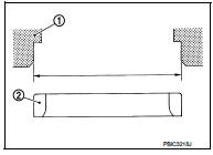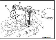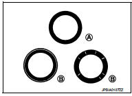 • If not, grind to adjust valve fitting and check again. If the contacting surface still has “NG” conditions (B) even after the recheck, replace valve seat. Refer to EM-92, "Disassembly and Assembly".
