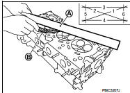 2. At each of several locations on bottom surface of cylinder head, measure the distortion in six directions using straightedge (A) and feeler gauge (B).