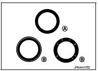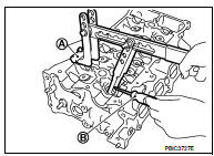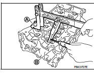 • If not, grind to adjust valve fitting and check again. If the contacting surface still has “NG” conditions (B) even after the recheck, replace valve seat. Refer to EM-211, "Disassembly and Assembly".