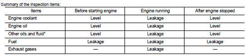 • Before starting engine, check oil/fluid levels including engine coolant and engine oil. If less than required quantity, fill to the specified level. Refer to MA-13, "Fluids and Lubricants".