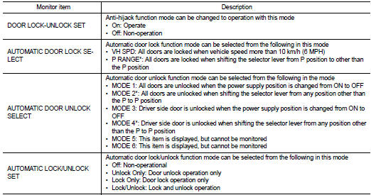 *: P range interlock door lock can be selected for M/T models, but automatic door lock/unlock function does not operate.