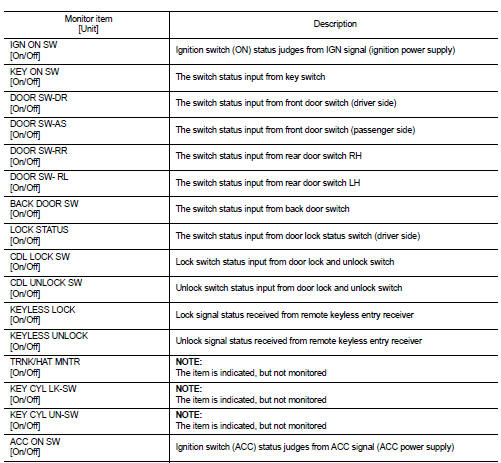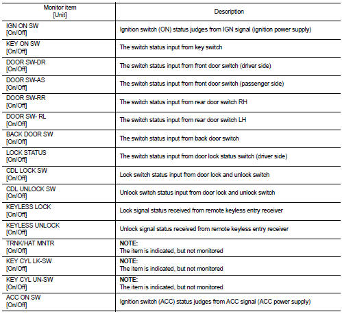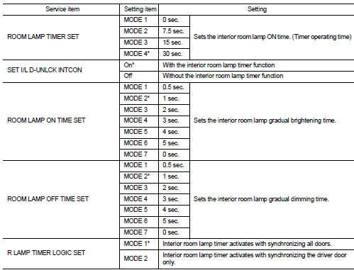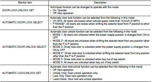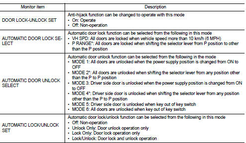 *: P range interlock door lock/unlock can be selected for M/T models, but automatic door lock/unlock function does not operate.